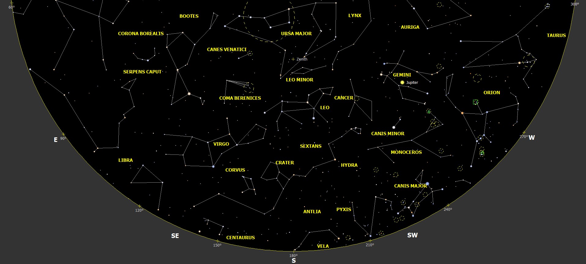 Júpiter, es visible casi toda la noche, con mg. -23 en el centro de la constelación de Géminis; a finales de mes se pone a primera hora de la madrugada. Siguen siendo visibles todo tipo de eventos entre sus satélites, con eclipses y ocultaciones, etc; se pueden consultar las efemérides de los eventos con cualquier planetario de ordenador como Stellarium y/o Sky Safari Pro.